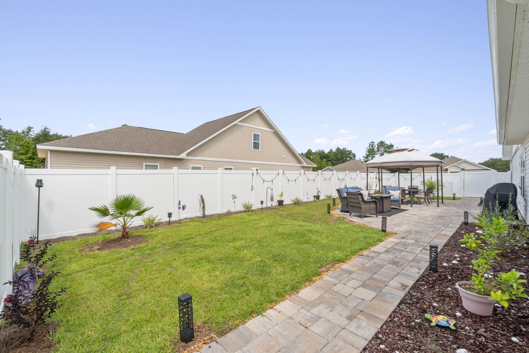 This gently lived-in-2 yr old home offers the rare blend of contemporary design, functional comfort, and an abundance of outdoor living space! A standout feature is the fully fenced large, private side yard (easily accessed from the living area) adorned with beautiful brick pavers, lush landscaping, irrigation and a soft-top gazebo that offers shade for outdoor dining, morning coffee or family gatherings. The LVP flooring seamlessly connects the living areas, while plush carpeting lends comfort to each of the 3 bedrooms. The split floorplan provides privacy for the primary bedroom and an open flow between the kitchen, dining and living spaces - ideal for entertaining.